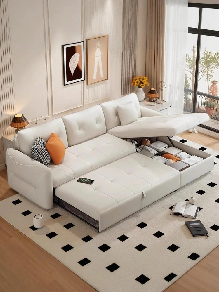 現代フレンチスタイルのクリームソファベッド、伸縮可能で小型リビングに最適!ウォールレスデザイン、調整可能な本革電動ソファで、快適さとスタイルを両立。限られたスペースでも贅沢なリラックスタイムを実現します!