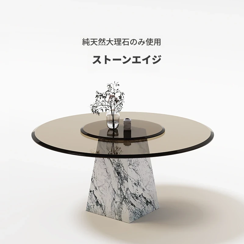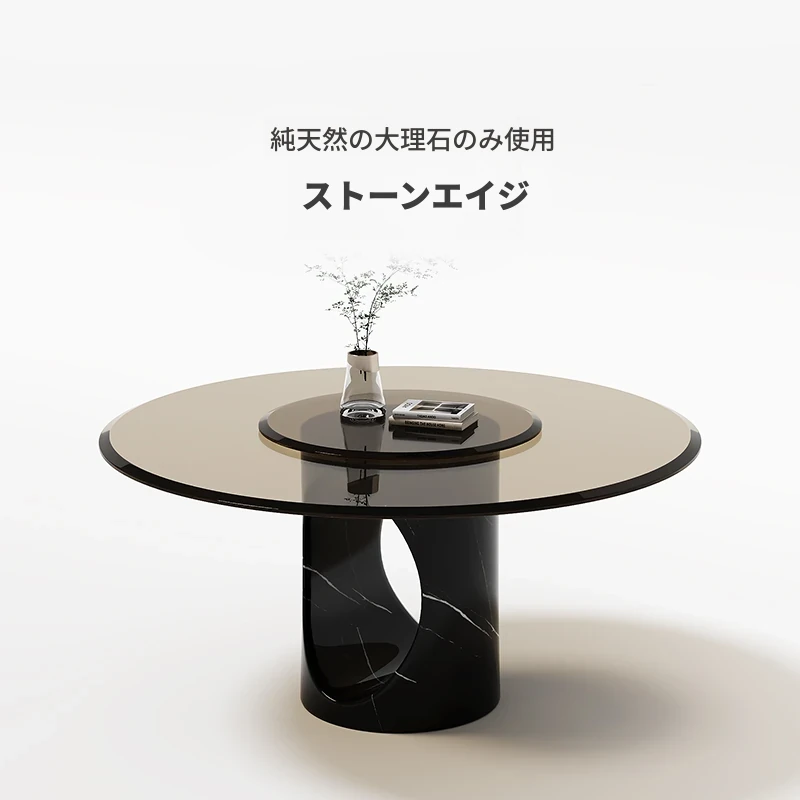 天然大理石の円形ダイニングテーブル - スタイリッシュなデザインとアートな雰囲気、強化ガラスの天板付き、イタリアンミニマルスタイルの回転台付きで、あなたの食卓を華やかに演出します!