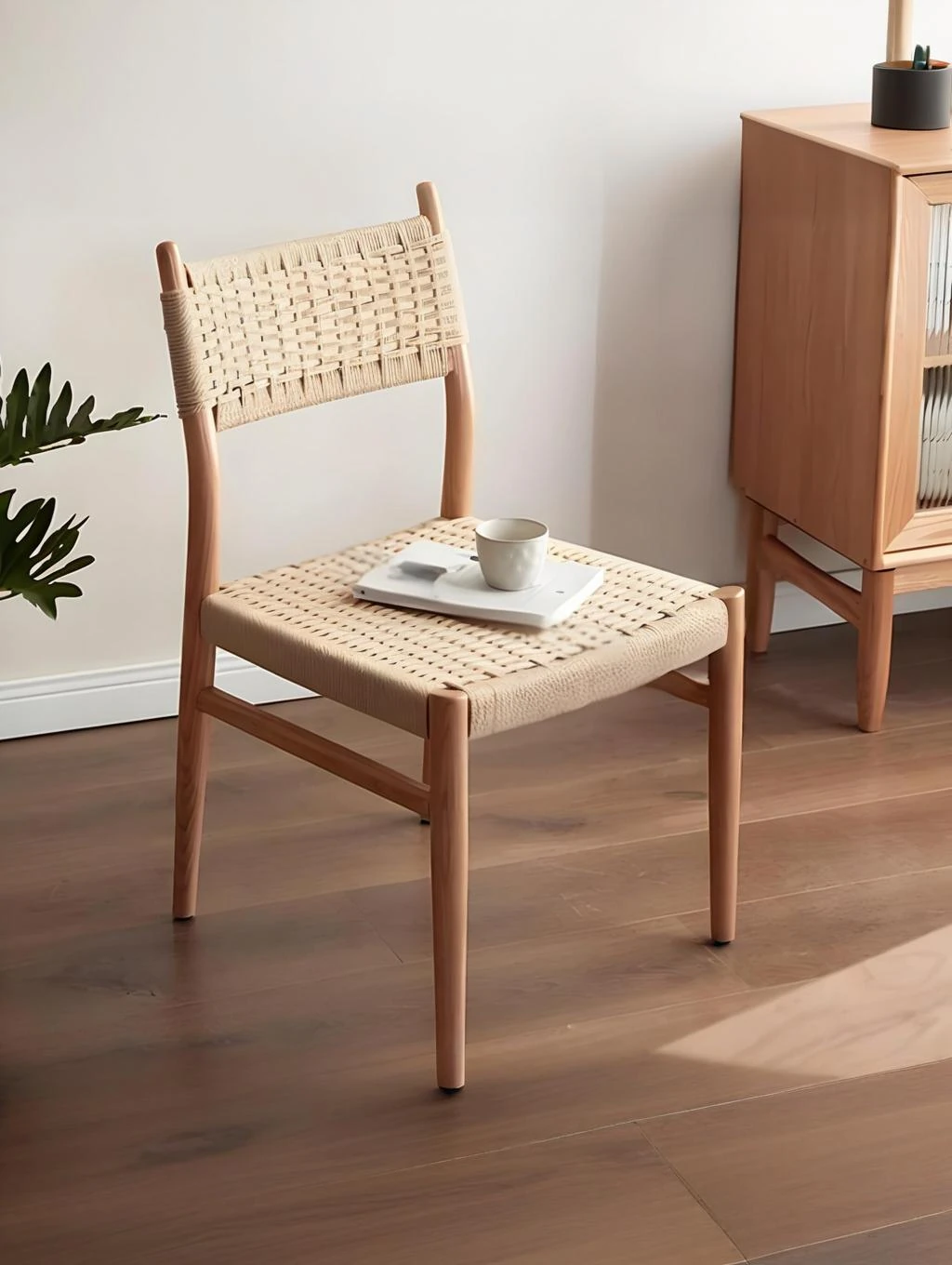 2025 New Nordic Minimalist Solid Wood Dining Chair with Woven Backrest - Vintage Style Tea Chair for Home, Embracing Wabi-Sabi Aesthetics