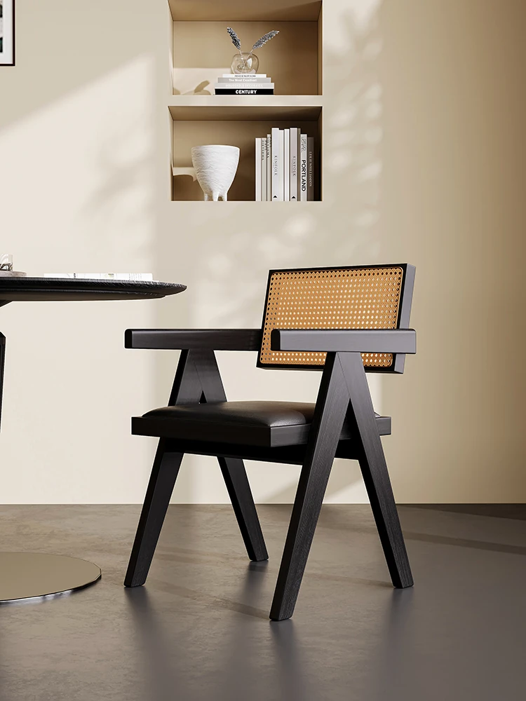 Solid Wood Dining Chair - Vintage Chandigarh Style, Wabi-Sabi Soft Cushion Armchair, Elegant Rattan Leisure Chair for Home Use