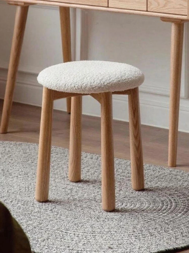 Nordic Minimalist Solid Wood Vanity Stool for Girls' Bedroom - Soft Padded Makeup Stool with Cozy Lambswool Upholstery, Perfect for Home and Dressing Rooms, Round Design
