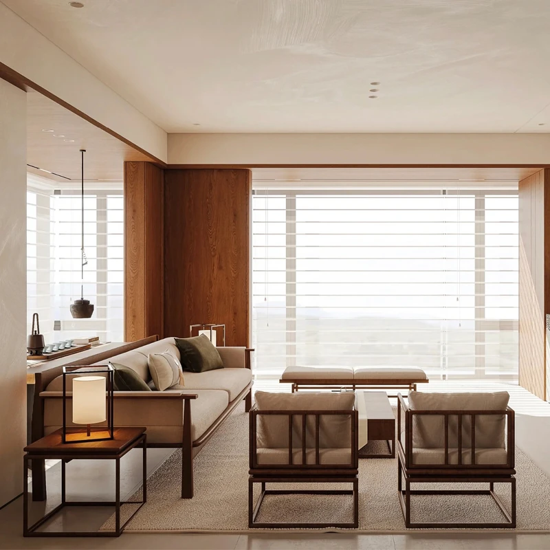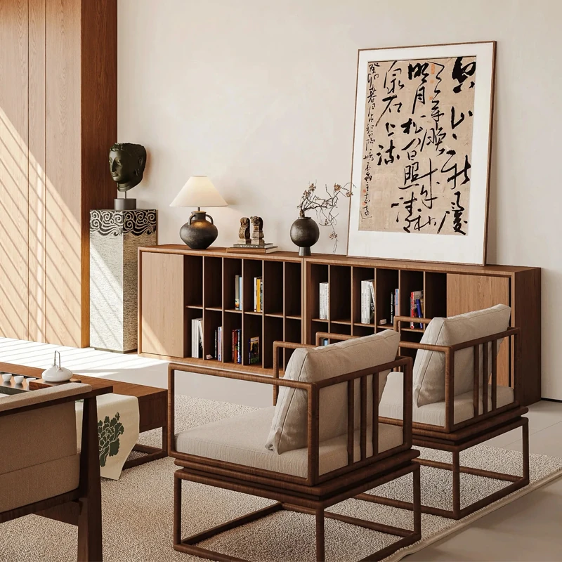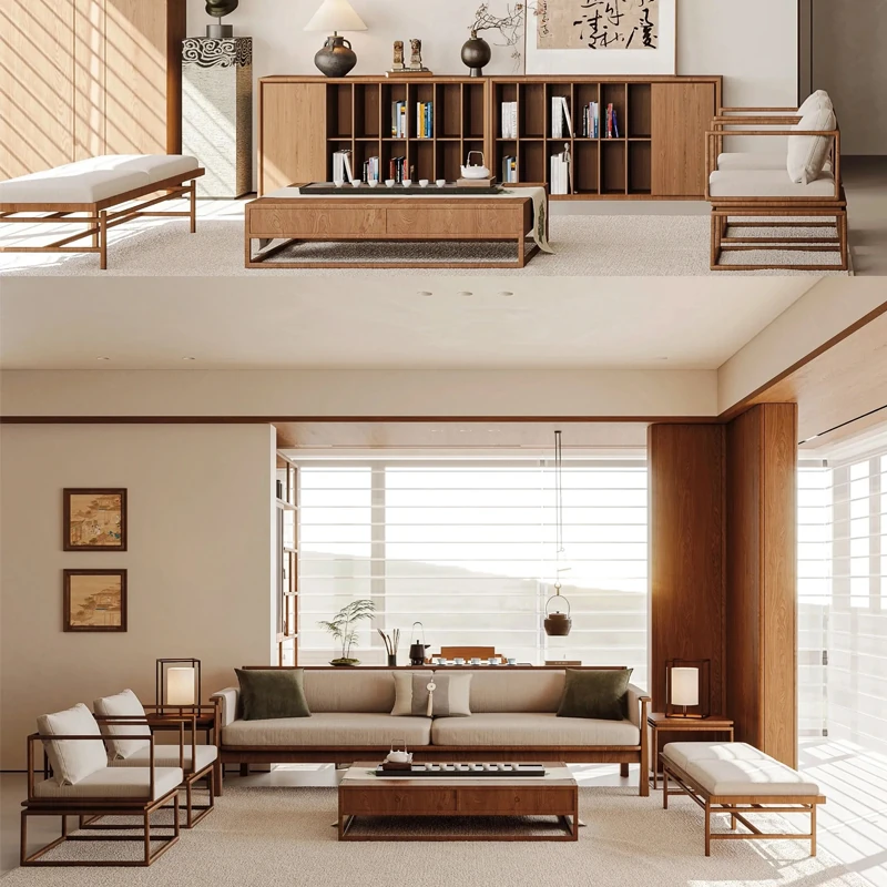 Japanese Wabi-Sabi Style Walnut Solid Wood Sofa Set - Versatile for Winter and Summer, Minimalist Fabric Cushions, Perfect for Office Use
