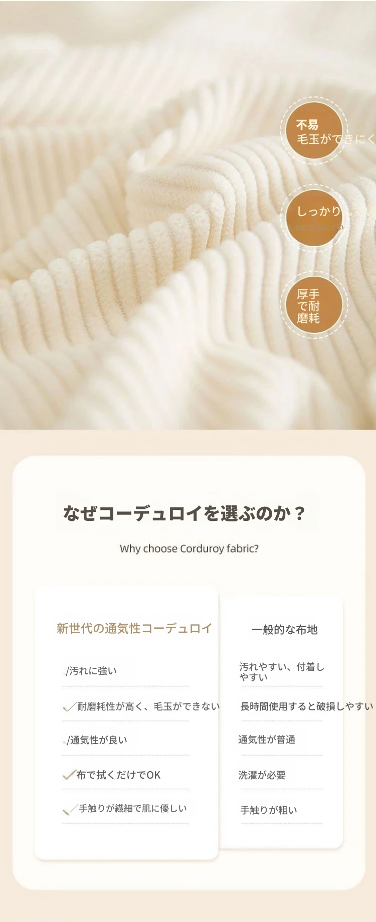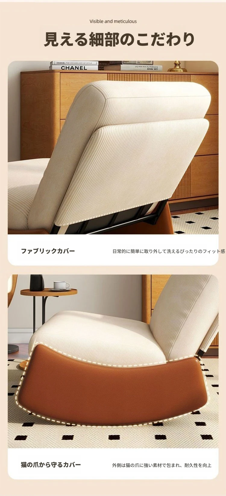 【ブラウン猫爪皮★洗える★多段階調整背もたれ】アイボリーコーデュロイ