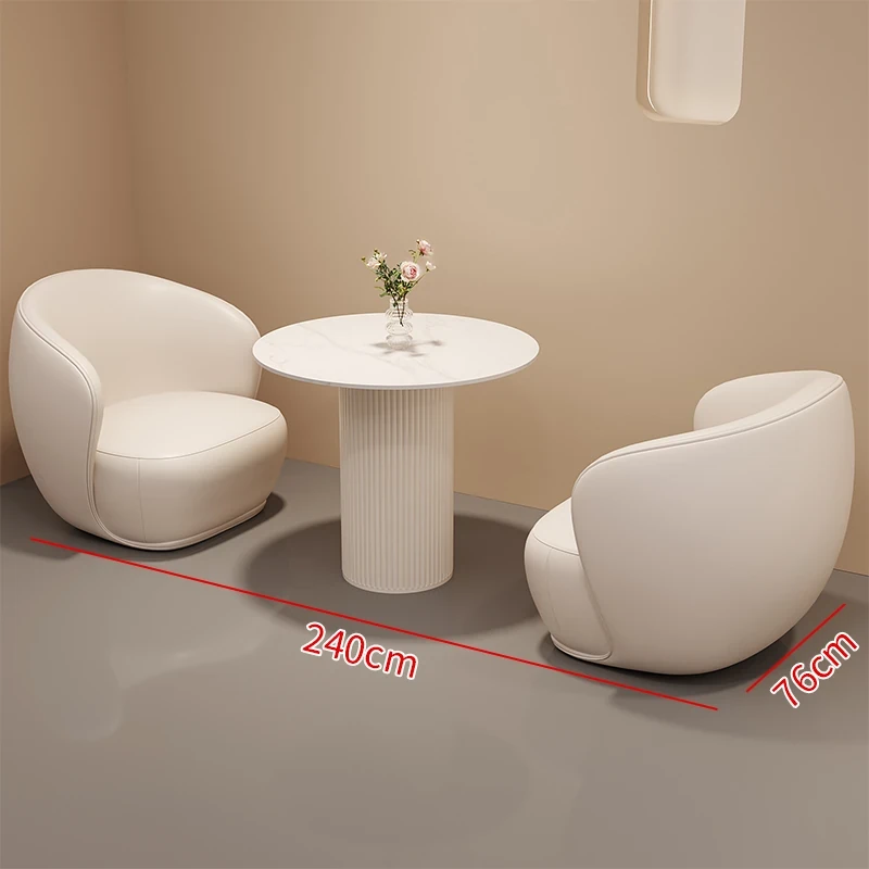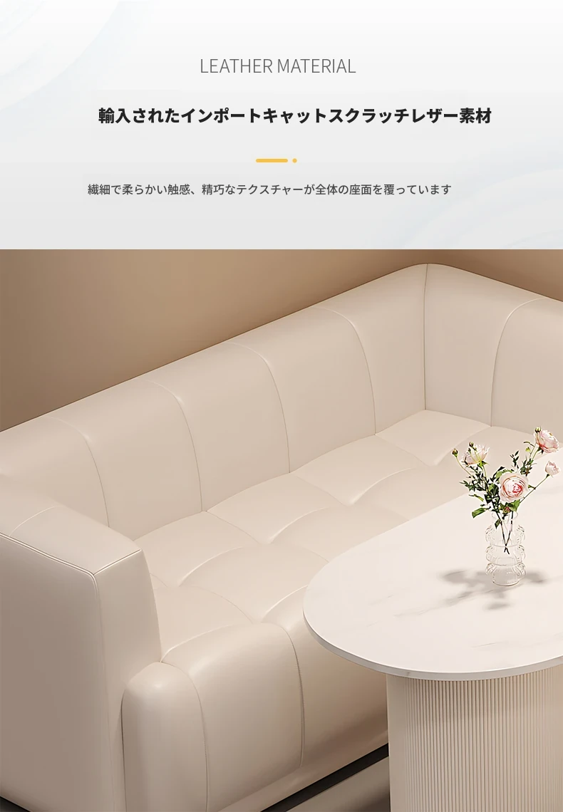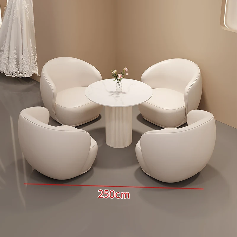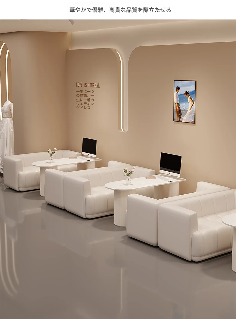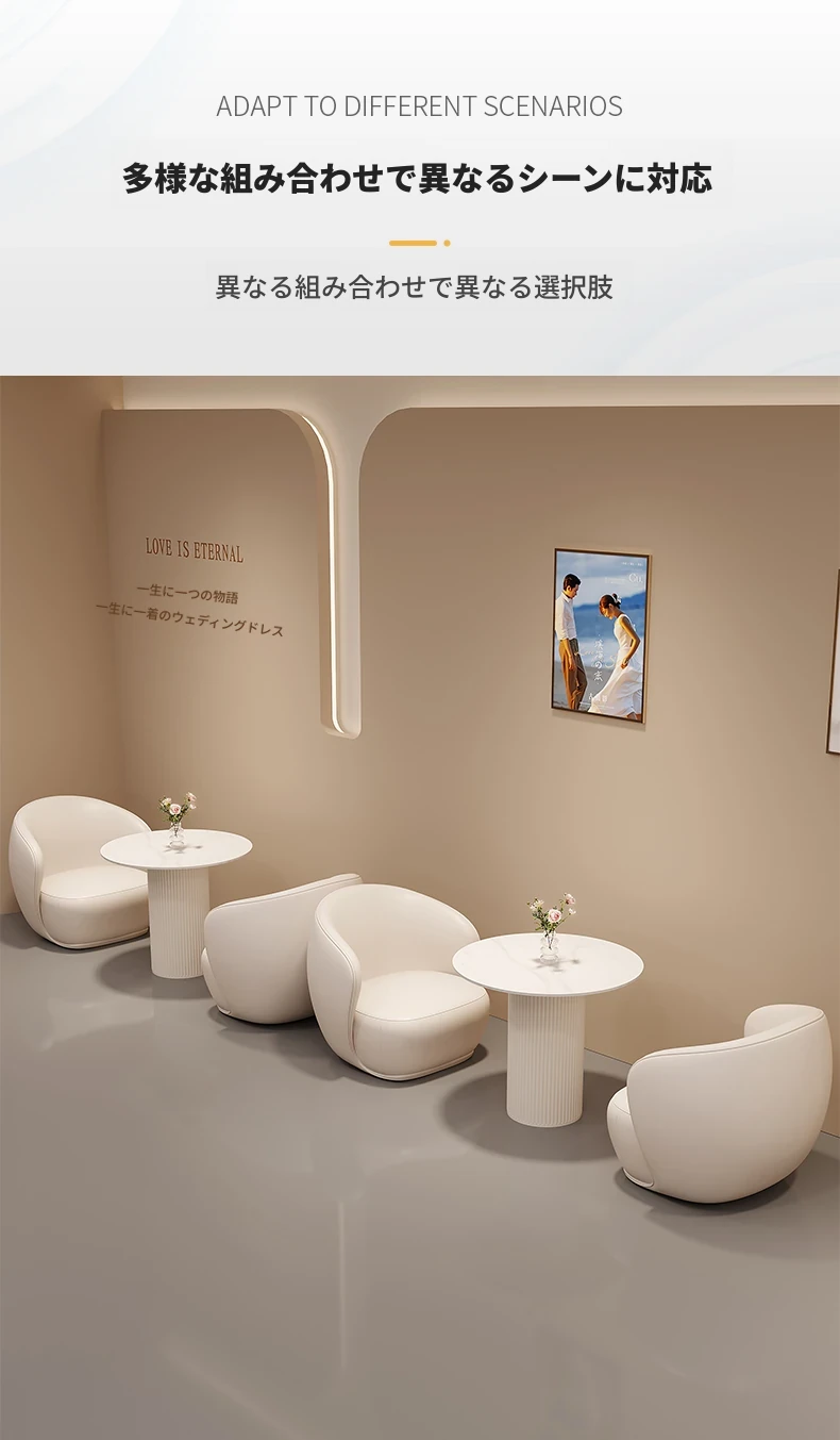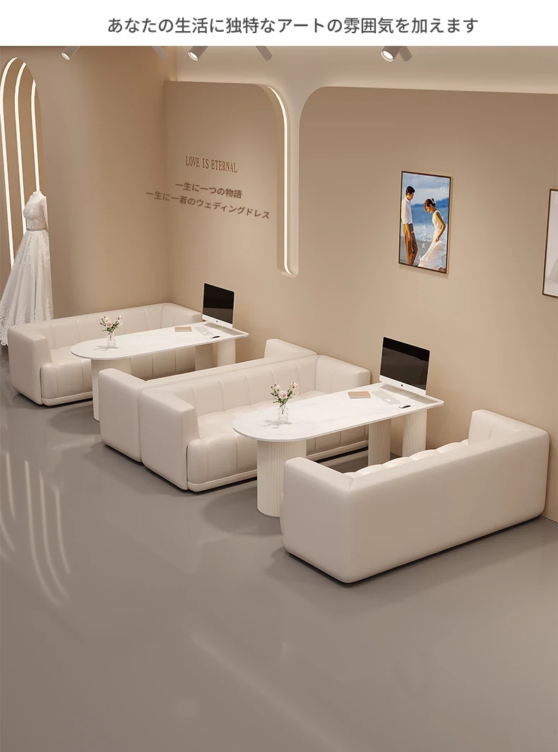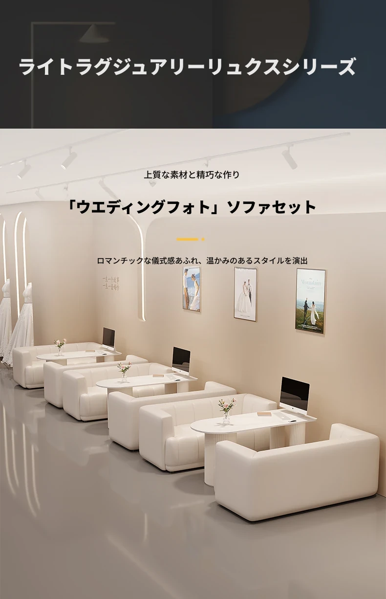 クリーム風のウェディングドレス店にぴったり!接客に最適な談話用ソファセット。美容院やリラックススペースにも最適なカジュアルなテーブルと椅子のコンビネーションで、心地よいひとときを提供します。