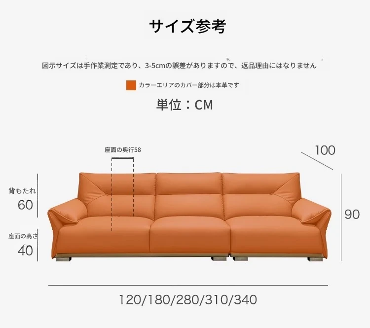 3.4メートル大三人掛け【2.0厚の輸入本革】
