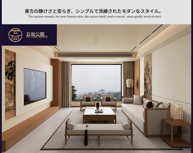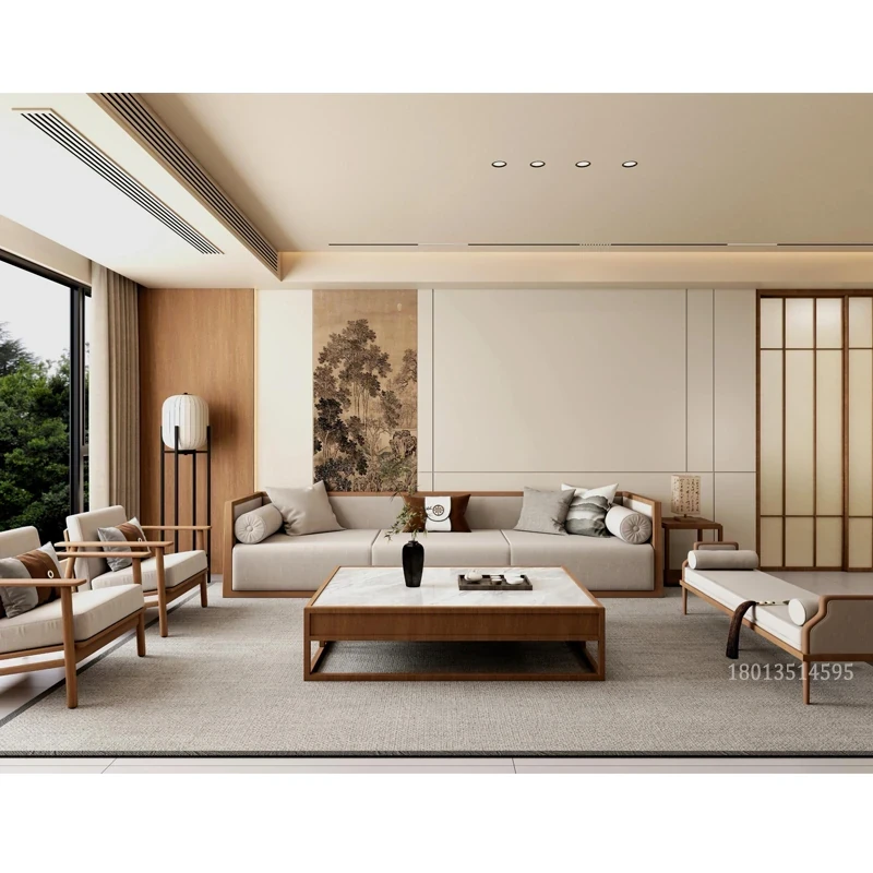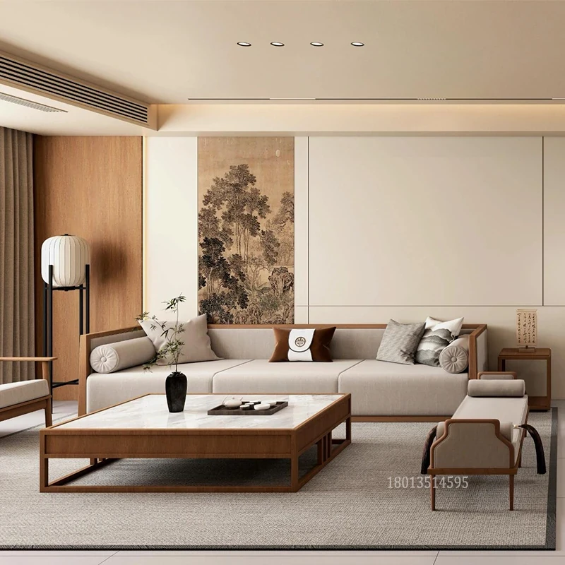 宋代美学を取り入れた新中式の高級実木ソファセット|現代的でシンプル、別荘のモデルルームにもぴったりなリビング家具です。上質なデザインで、贅沢なひとときを演出します。