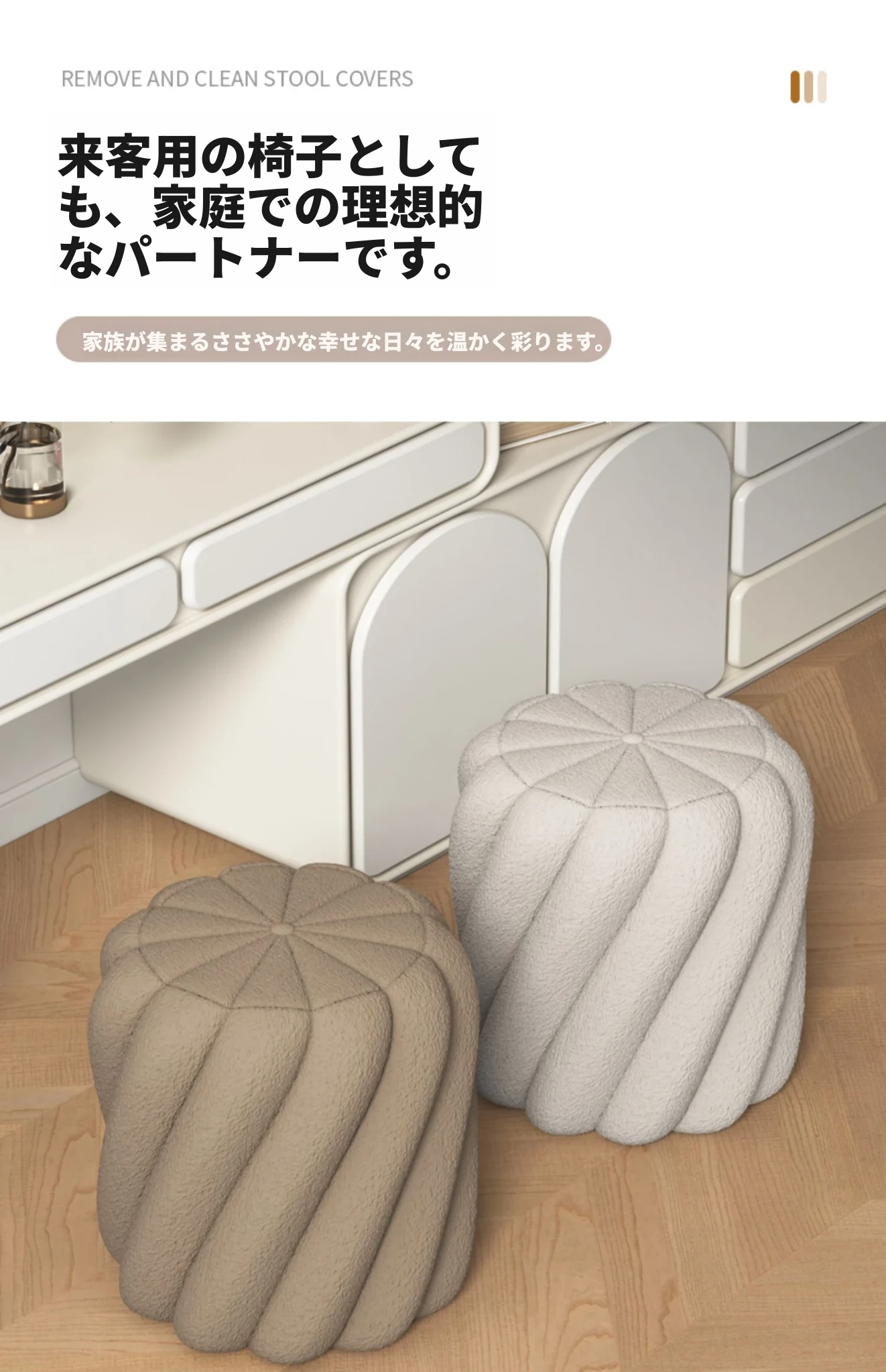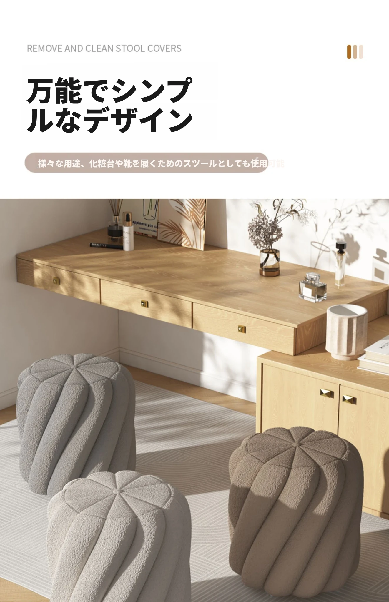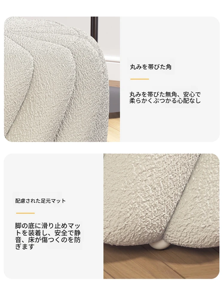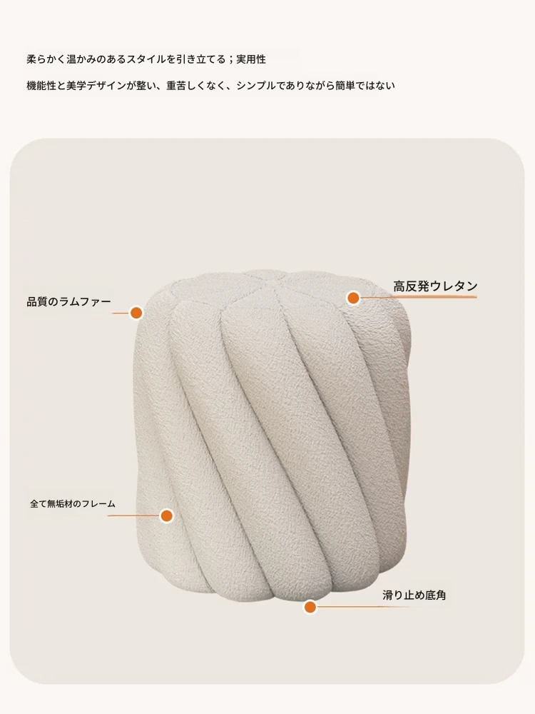 ラグジュアリー感溢れるシープスキンメイクアップスツール|女性のための上品な化粧台椅子|寝室やドレッシングルームにぴったりの丸型スツール|靴を履き替える時にも使える便利なアイテム!