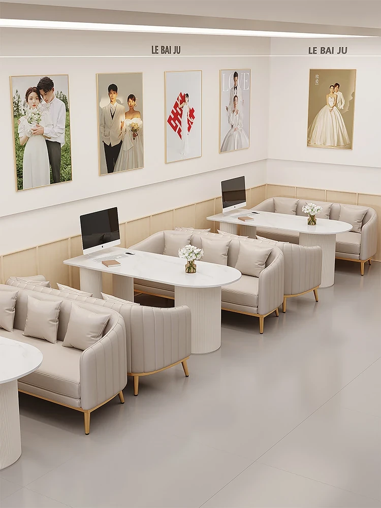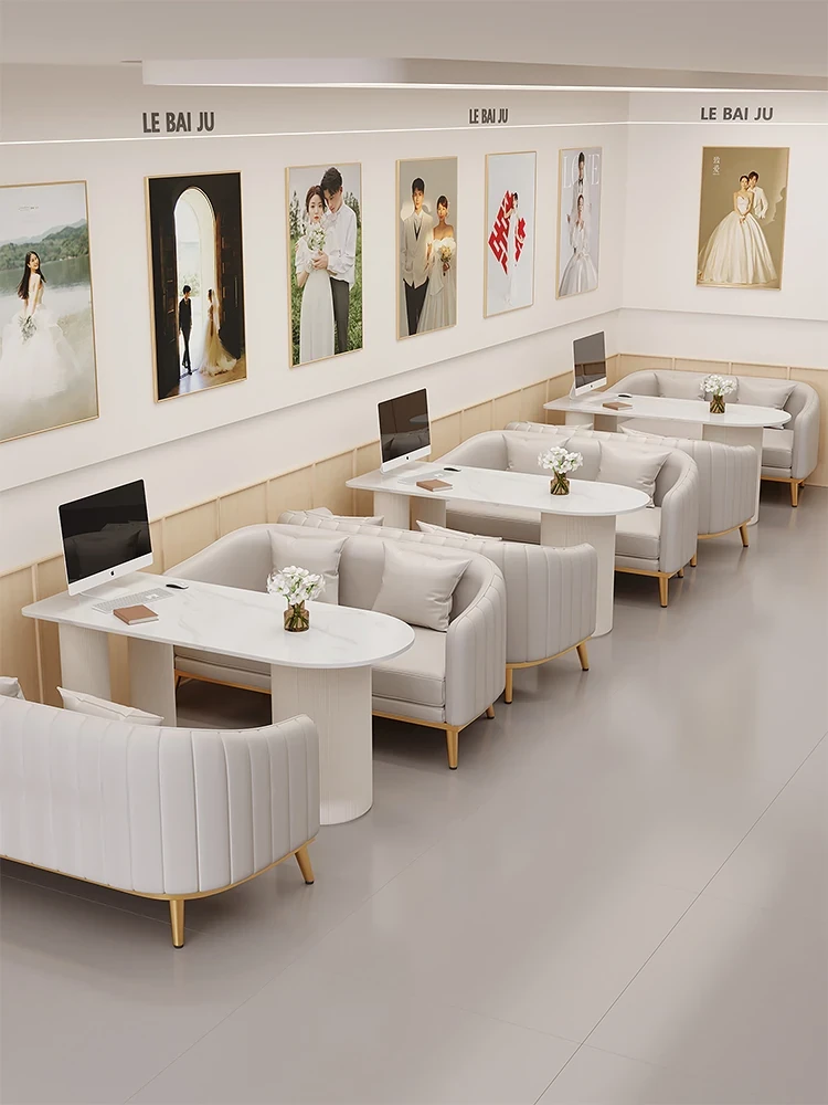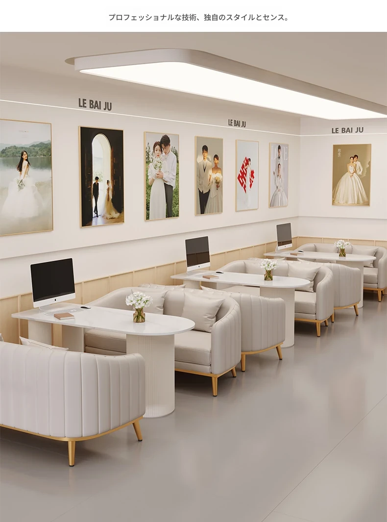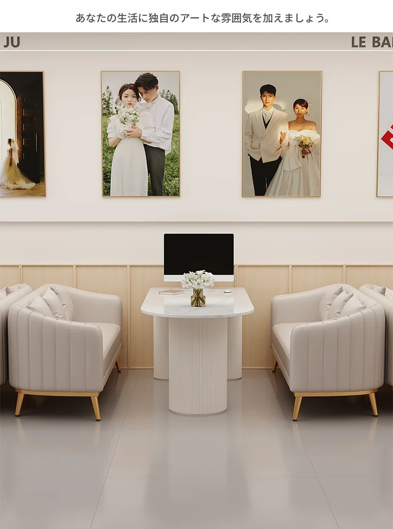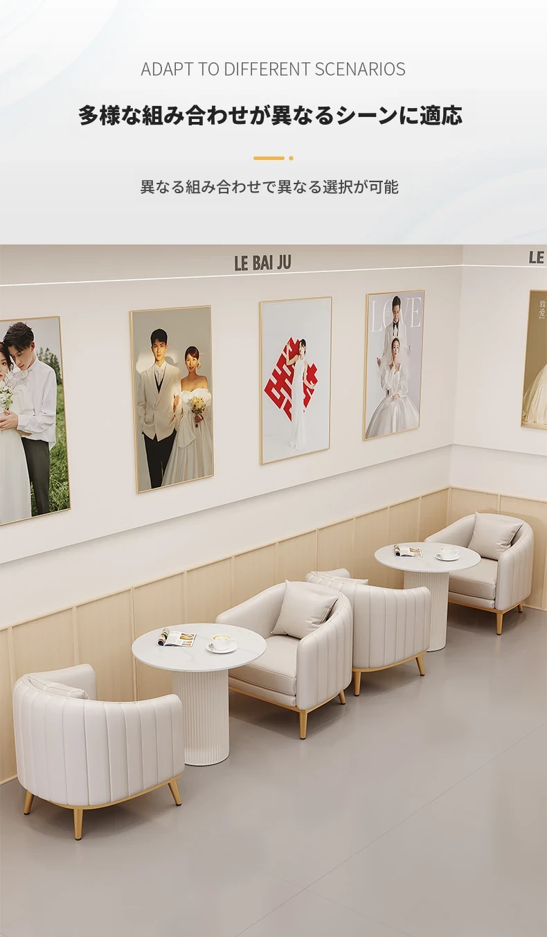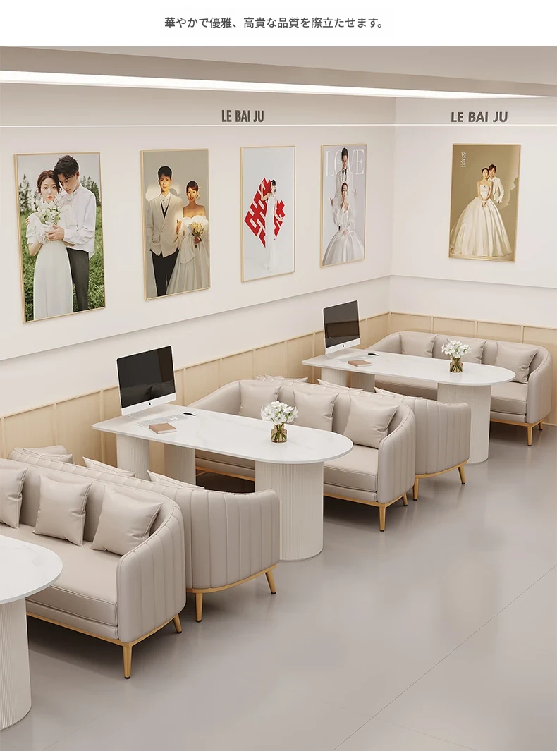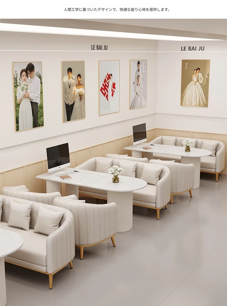 人気のフォトスタジオ向け!ウェディングドレス店の休憩エリアに最適なソファセット。美容院の打ち合わせや接客にもぴったりなカードソファとテーブルのコンビネーション。快適でおしゃれな空間を演出します!