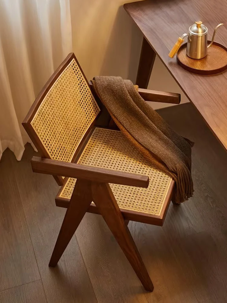 中古の無垢材ダイニングチェア|家庭向けチャンディガール藤編み椅子|バルコニー用リラックスチェア|背もたれ付きダイニングテーブルチェア|侘び寂び風の藤椅子で、和やかな食卓を演出!